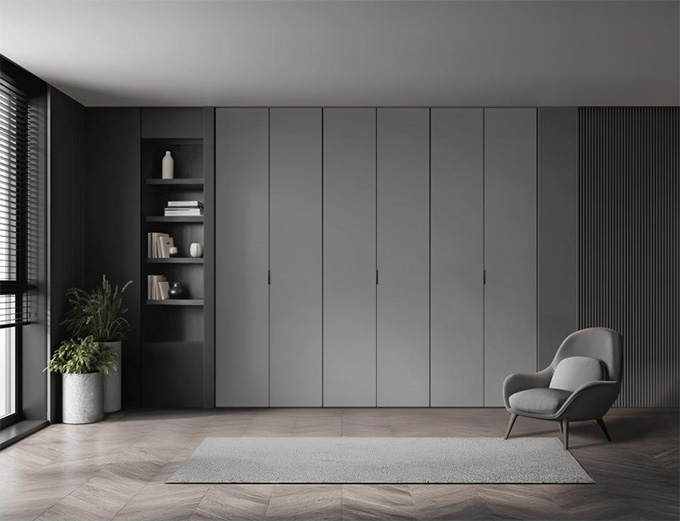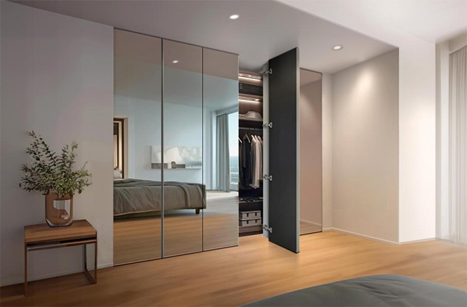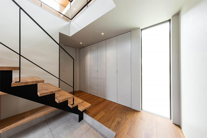 KAMIYAはクローゼット扉にもこだわります。天井まで届く高さが収納力を高め、壁と一体化したデザインだから、何枚扉を並べても圧迫感がありません。クローゼット扉もフルハイトにすることで、シンプルで心地よい暮らしに繋がります。