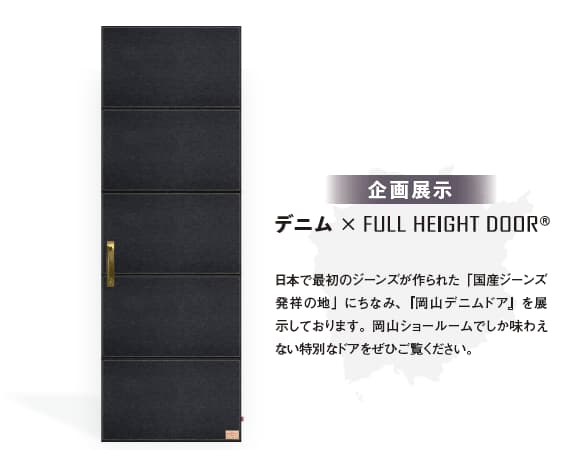 日本で最初のジーンズが作られた「国産ジーンズ発祥の地」にちなみ、「岡山デニムドア」を展示しております。