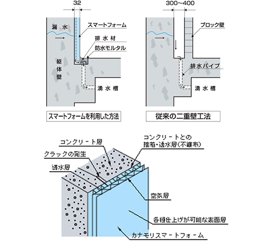 スマートフォームは、カナモリが中心に開発した地下防水施工に使用する二重壁代替打込式型枠です。