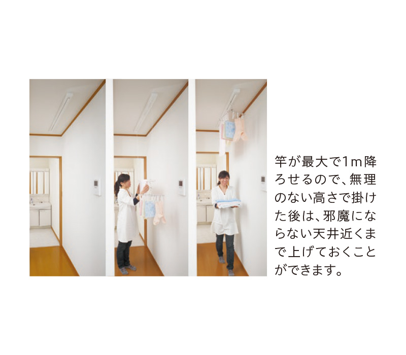 ■物干竿を昇降させる事で、洗濯物を邪魔にならない高い位置で干すことができます。