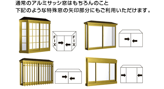 ③通常のアルミサッシ窓はもちろんのこと、下記のような特殊窓の矢印部分にもご利用いただけます。