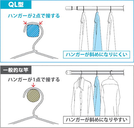 四角いカタチにより、ハンガーが竿の2点に接することで、ハンガーの向きを揃えやすくする効果があります。そのため衣類間の風通しの良い状態を保ちやすくし、見た目にも美しく干すことができます。