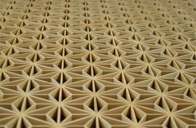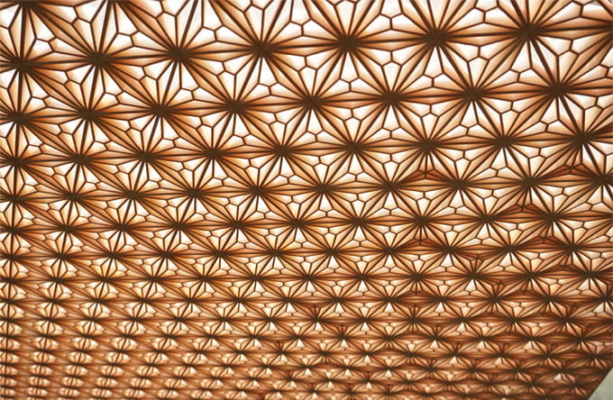 組子細工は、精密加な幾何学模様が連続で表現される美しさに特色があり、従来は障子や欄間などの和風建築に使われてきました。この技法を用いたインテリアを開発し、設計事務所やデザイナーを通じて、高級ホテルや商業建築物等の内装装飾用途で採用されています。