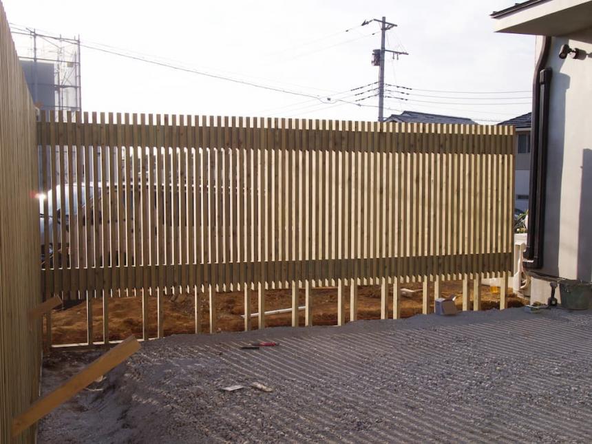 角材に丸棒を通してフェンスパネルを作るので、リバーシブルで格好よく、まるごと加圧注入釜で防腐処理するので、長寿命で、施工も容易。