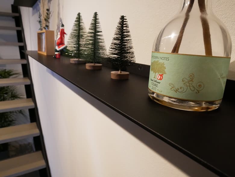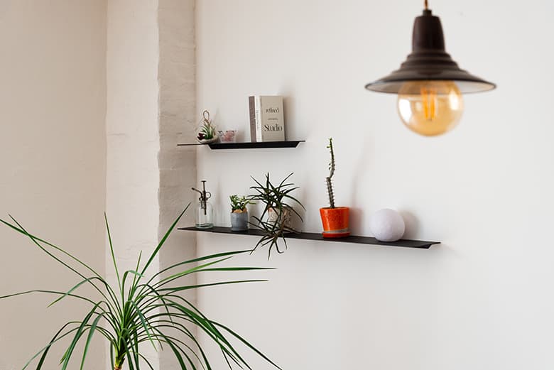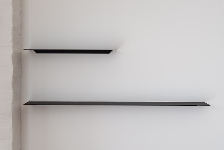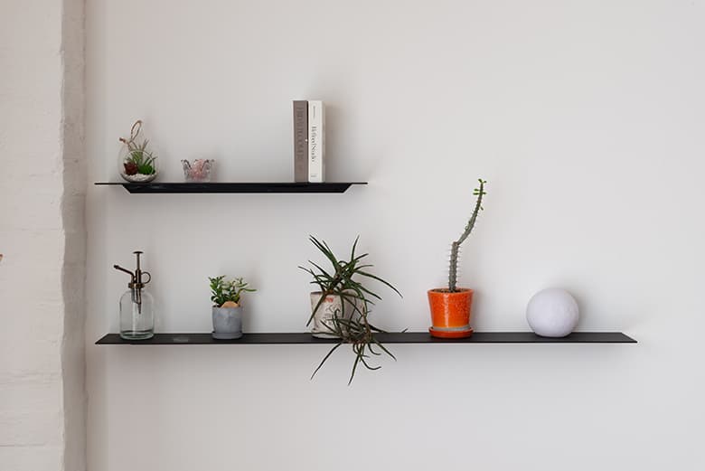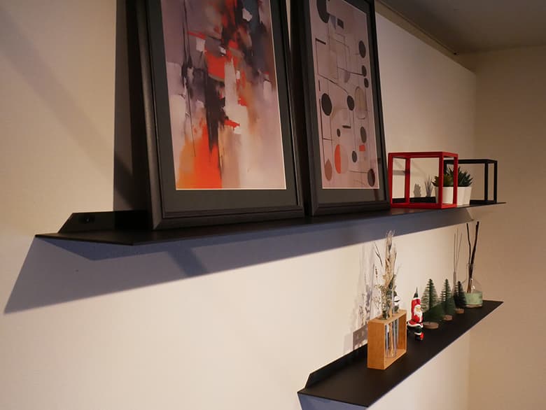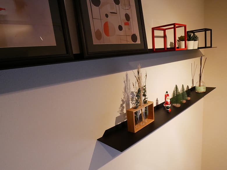 スチール製なので、わずか3.2mmという薄さでありながら、必要十分な耐荷重を誇るのも特徴です。耐荷重は、W600サイズの場合で10kg、W1200サイズの場合は20kgまで対応。インテリアの一部として装飾小物を並べる用途で使うには十分な強度です。