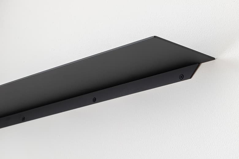 シェルフ自体が主張することなく、空間に馴染むことが最大の特徴である『STELF』。無駄な装飾がないからこそ、角部の絶妙なRや塗装の滑らかさ等、細部の仕上がりにこだわりました。固定部は両端部を30mmセットバックさせることで、極力目立たないように配慮されています。