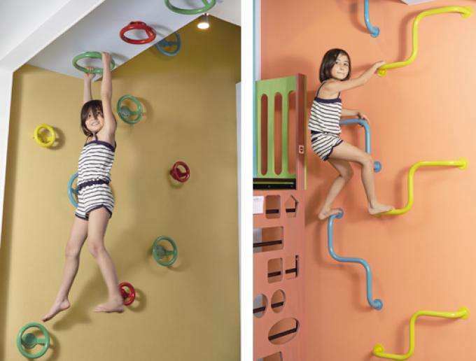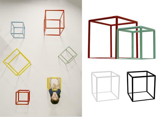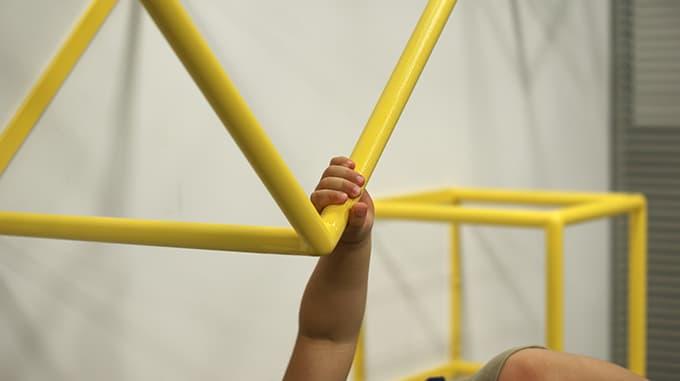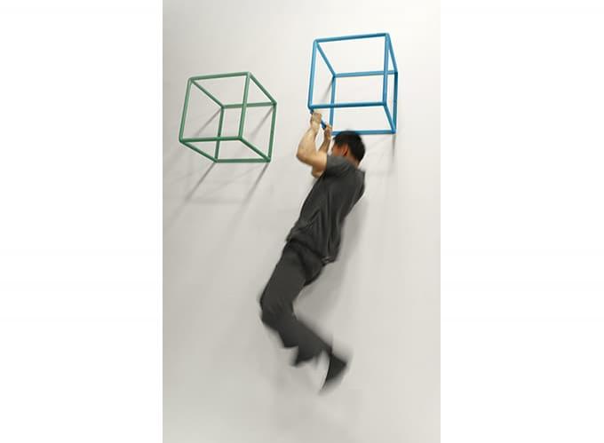 『CUBE』はパイプを立方体にしたデザインで、既存のDECOのように壁に好きな間隔で配置します。使い方は様々で複数個使いうんていやブルダリングのようにしたり、1個でけんすい棒や腹筋のバーとして使ったり、子どもは壁を公園に見立てて遊べるように。大人は本格的なスポーツジムに来たかのように運動することができます。
