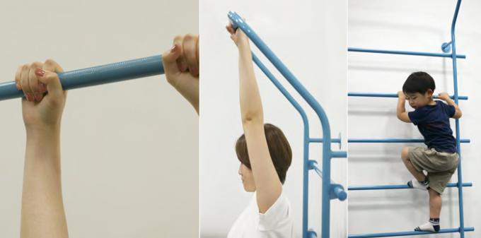 使用法としてはぶら下がったり背中を伸ばすストレッチから、けんすいや腕立て伏せといったトレーニング、はたまたうんていにつながる“はしご”としてなど様々な使い方が可能です。