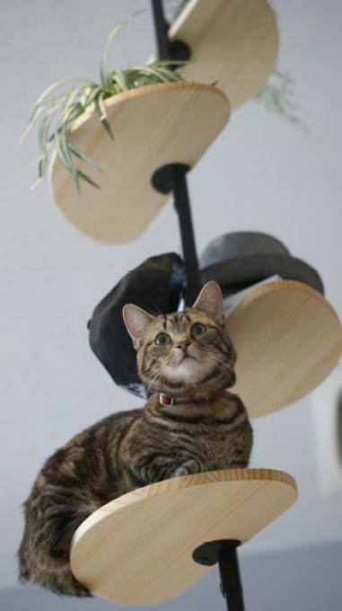 キャットタワーとして使う場合は、猫の成長に合わせていつでも100 ㎜間隔で空いている穴に合わせて高さ調整ができるほか、この半円ボードはクッション性の高いラジアータパイン集成材を利用しているため、猫の上り下りの負担も軽減できます。