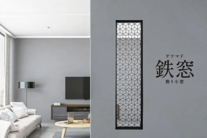 『鉄窓』は、日本の伝統工芸「組子」をモチーフにした幾何学模様を組み込んだ小窓で、室内壁を彩ることができます。伝統工芸をスチール加工技術で代替。レーザーで加工したスチール板を重ねる構造であり、木材を加工して作るには難易度が高い文様を表現できることが、本商品の特徴です。