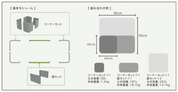『囲』は直パーツとコーナーパーツとで部品が分かれており、組み立てて使用します。簡単に組み立て、分解が可能なので、大掛かりなレンガや石素材のものと比べて手軽に始められます。そのため、家庭菜園が未経験の方でも簡単にスタートすることができます。また、パーツを追加することで、後から拡張できる点も特徴です。