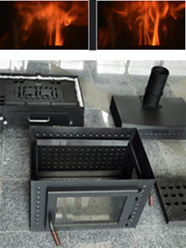 燃焼室の内壁を構成する独自のパイプウォール燃焼システムは、下部から上部へ新鮮な空気を供給することで不完全燃焼を抑えながら煙の発生量も抑制。同時に燃焼効率をアップすることで、薪をムダなく使うことができます。