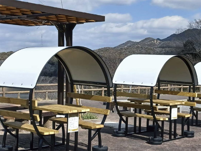 「テーブルハウス」は屋根・テーブル・ベンチの一体型となっており、設置するだけで手軽に休憩スペースとしてお使い頂け、実際に利用した方がSNSに投稿するなど、映えスポットとしても人気です。