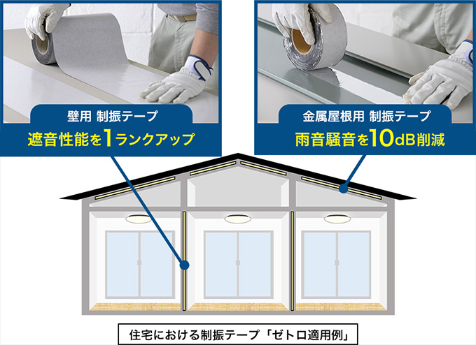 壁用制振テープと金属屋根用制振テープは、自動車/新幹線などで幅広く使われている制振シート「ゼトロ」を建築用にチューニングした製品です。