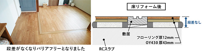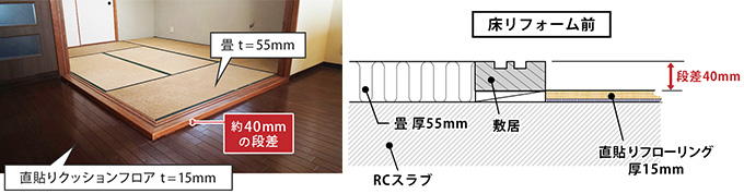 マンションのリフォームにあたり、オーナー様より畳/直貼りクッションフロアからフローリングへの切り替えを要望。更にマンション規約の床遮音性能LL-45、フローリングでのバリアフリー化も満たす必要がありました。