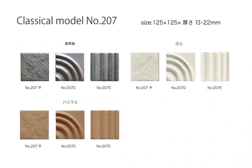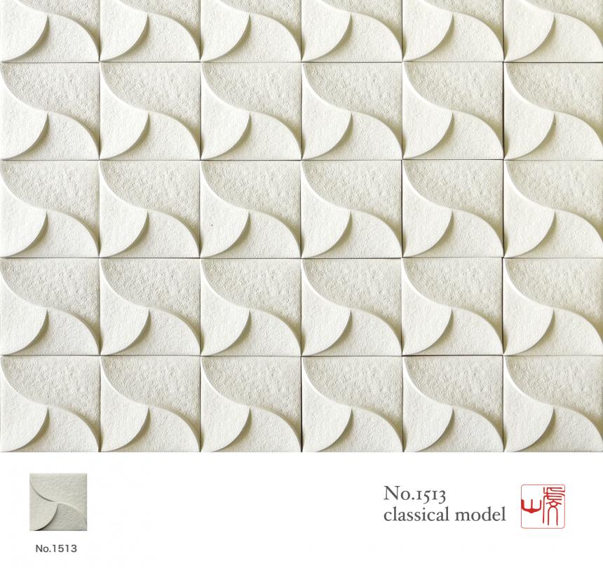 土肌のマチエールと連続する柄、土の温もりを布地のように織り込んだ繊細なディテールと陰影をつくる凸デザインは、壁面や空間に印象的な表情をつくり出します。また、並べ方で様々な表情を作ることのでき、No.207は日本庭園に見られる砂紋を感じさせる魅力的なタイル。
