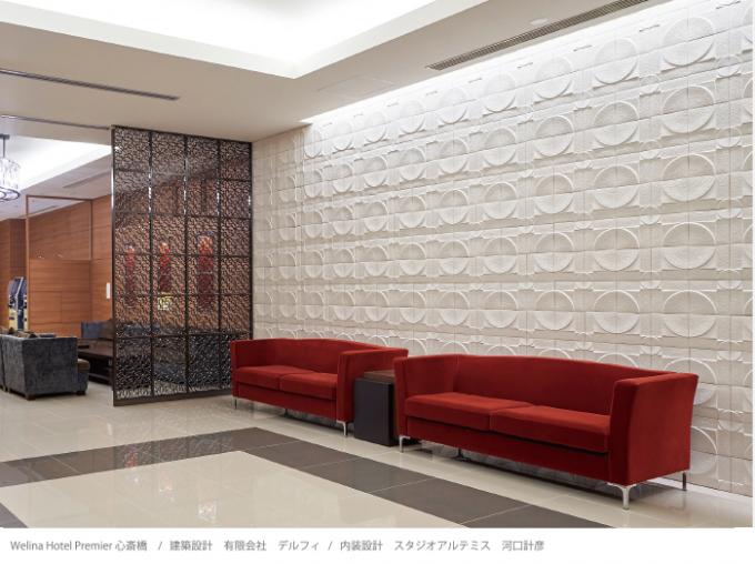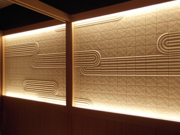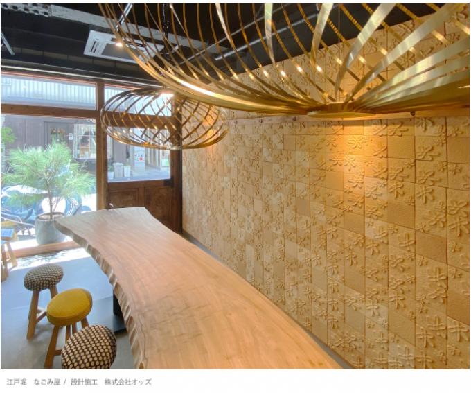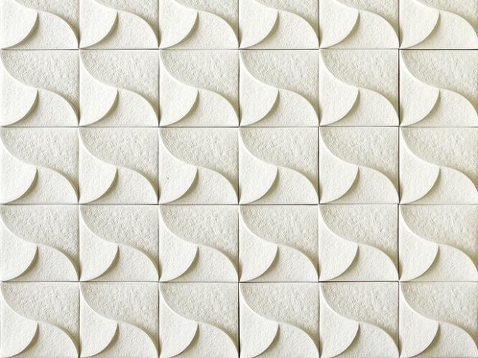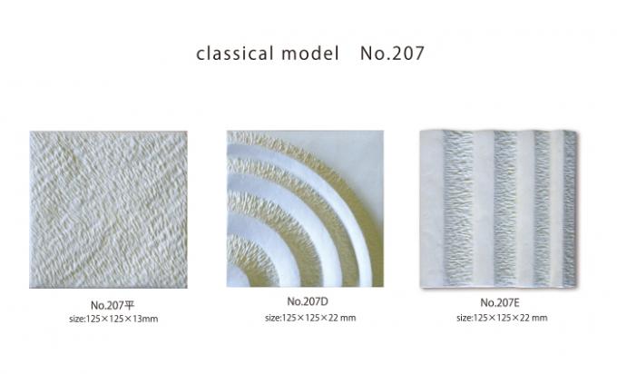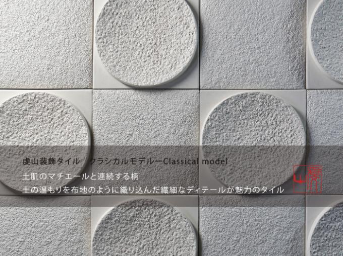 虔山〈kenzan〉の装飾タイルclassical modelシリーズは昭和の時代に生まれ、つくり続けてきたロングランのやきもの。 土肌のマチエールと連続する柄、土の温もりを布地のように織り込んだ繊細なディテールと陰影をつくる凸デザインは、壁面や空間に印象的な表情をつくり出します。