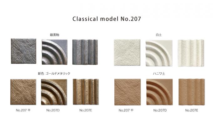 昭和の時代に生まれ、つくり続けてきたロングランのやきもの。デコウォールの魅力が注目される。やきもの独特の素材感、日本庭園にみられる砂紋を感じさせるフォルム、時を経てなお新鮮。クラシカルなタイル。並べ方で個性的な空間を演出。