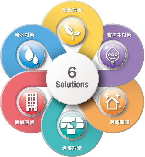 キクスイは建築用仕上塗材メーカーとして「塗装業」「防水業」「タイル業」「左官業」「吹付業」など、様々な業界と関わり、常に新たなテーマに挑戦し続けてきたからこそ提供できる6つのソリューションがあります。