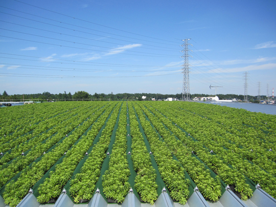 普通の屋上防水の上にシートを敷いて常緑キリンソウ入りの袋を並べるだけ。特殊な防水設備もいらず、しかも、太陽の紫外線から屋上防水層を守るので防水層の劣化を低減します。そして、屋上を断熱することにより、コンクリート躯体の温度変化を低減させ、建物の長寿命化にもつながります。