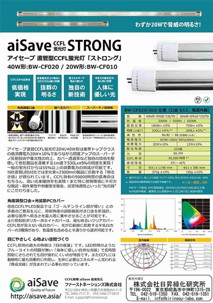 ■直管型CCFL蛍光灯アイセーブストロング40W形は業界チップクラスの消費電力20W±10%でありながら、照度アップの為のスーパーナノ反射板や集光性の向上、カバー透過率など独自の技術を駆使して他社製品を凌駕する1m直下で530Luxの照度を実現しました。また、本体がポリカーボネイト製でねじれる為、地震で落下しにくく、落下しても割れません。