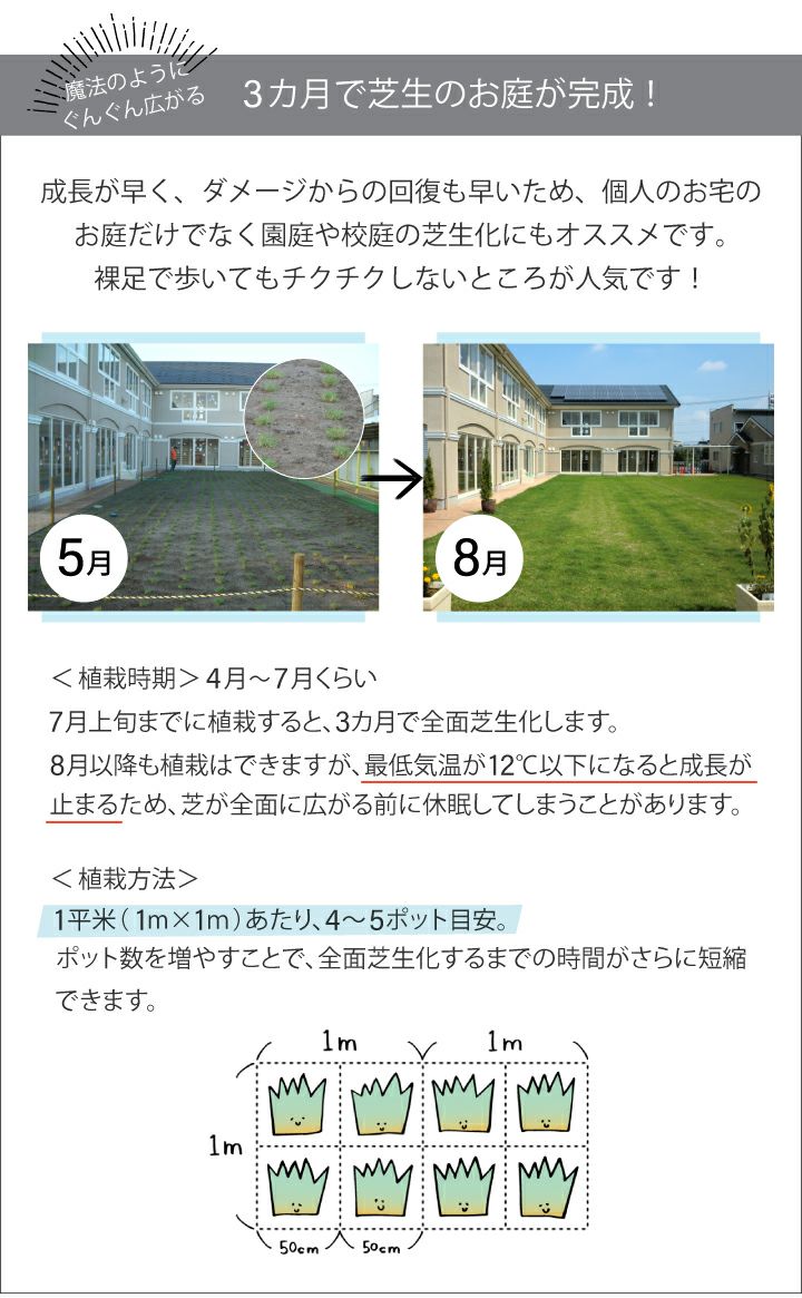 校庭緑化、園庭緑化など、広面積の芝生化を低予算で実現できます。