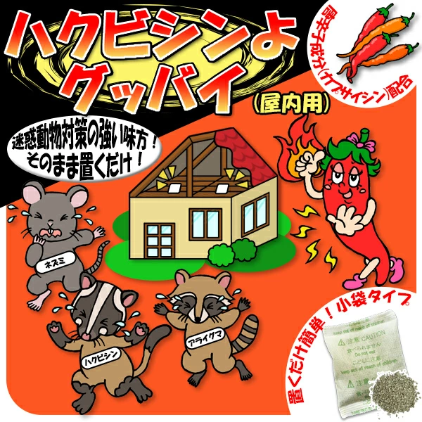 迷惑動物が出没する場所に小袋を置くだけの簡単設置。唐辛子のにおいで寄せ付けません!ハクビシンだけでなく、アライグマ、ねずみなどにも効果があります!
