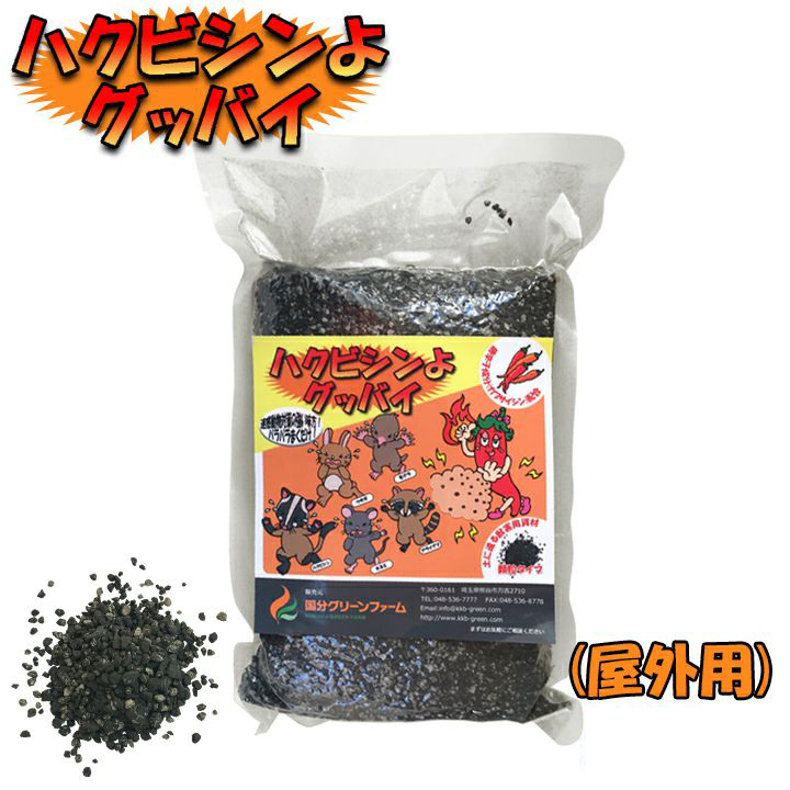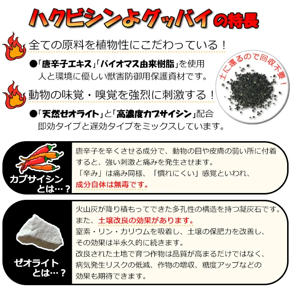高濃度のカプサイシン(唐辛子成分)と土壌改良効果のある天然ゼオライトを配合。速攻タイプと遅効タイプをミックスして効き目を長持ちさせます。全ての原料が植物性で、人と環境にも優しい獣害防御用保護資材です。「ハクビシンよグッバイ」は土壌改良の効果もあり土に還るので回収の必要がありません。