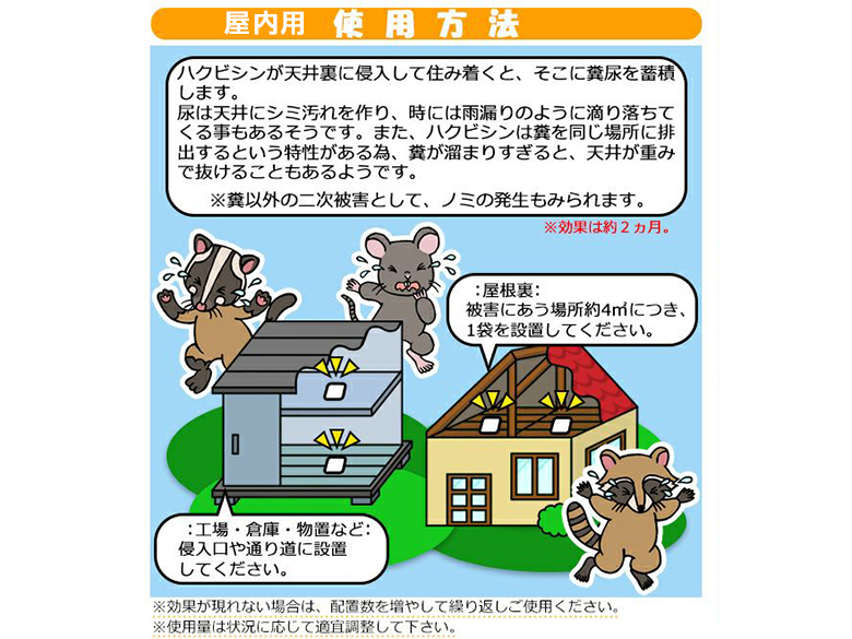 迷惑動物が出没する場所に、4平米あたり1袋を目安にハクビシンよグッバイ(屋内用)を置きます。設置後から唐辛子のにおいが広がり、迷惑動物を追い出し寄せ付けにくくします。