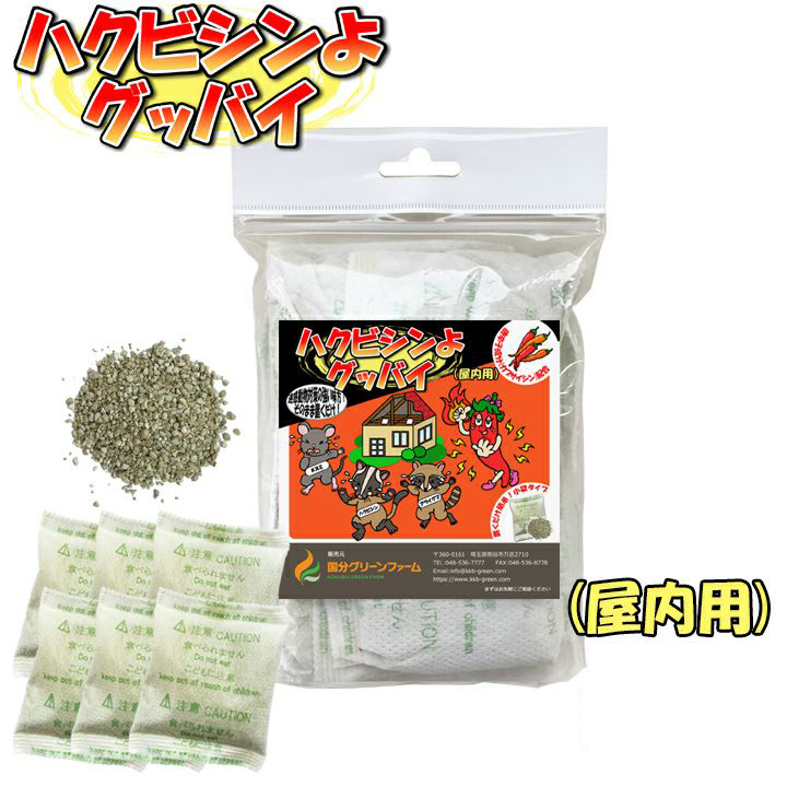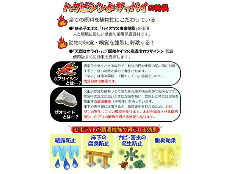 天然ゼオライトに高濃度のカプサイシン(唐辛子成分)を配合。速攻タイプのみを使用しています。(屋外用は速攻タイプと遅効タイプのミックス)天然ゼオライトは、脱臭効果や湿度を調整する効果があります。