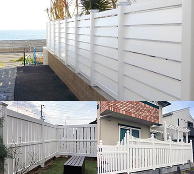 高品質PVC樹脂「塩ビ」を屋外で30年以上耐えられるようにした素材でつくられている為、木材や鉄製のフェンスより軽くて、強度は鉄やアルミ製のフェンスに比べて3~5倍です。塩害の心配もありません。