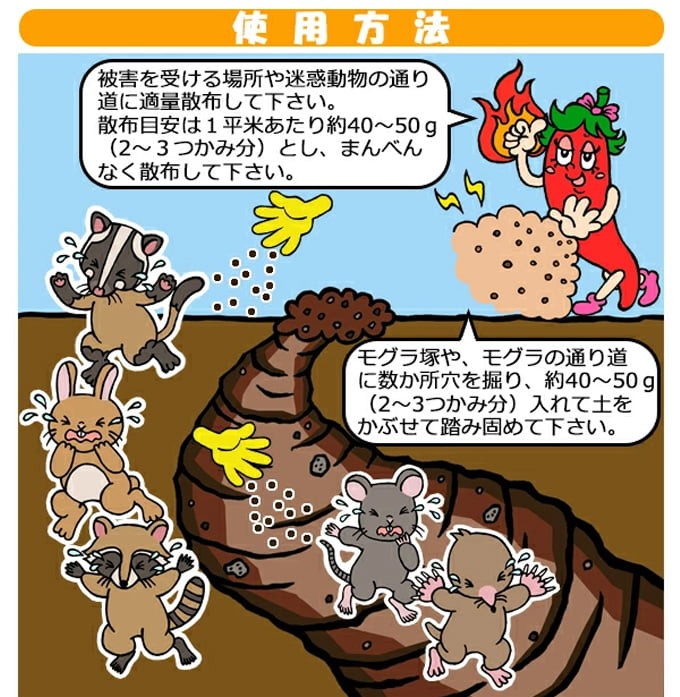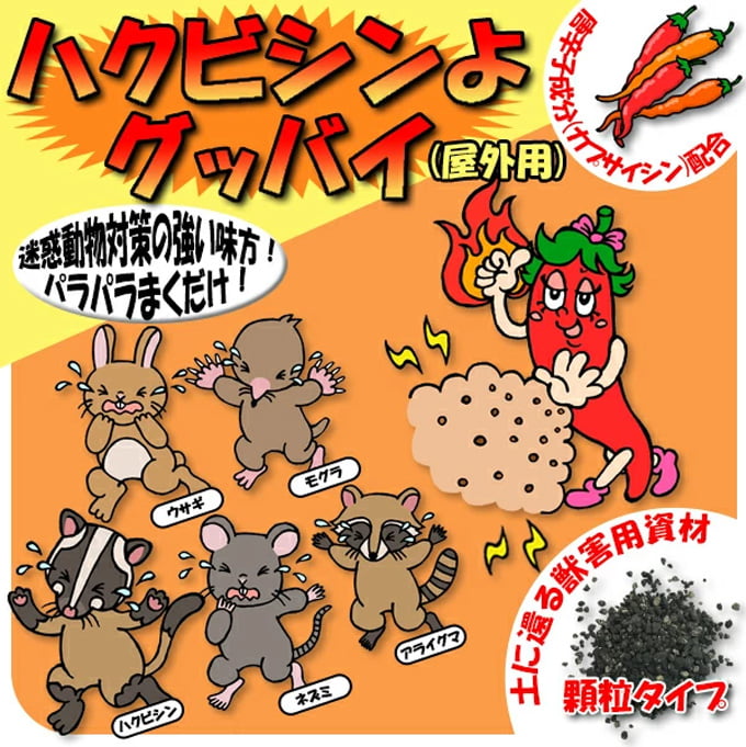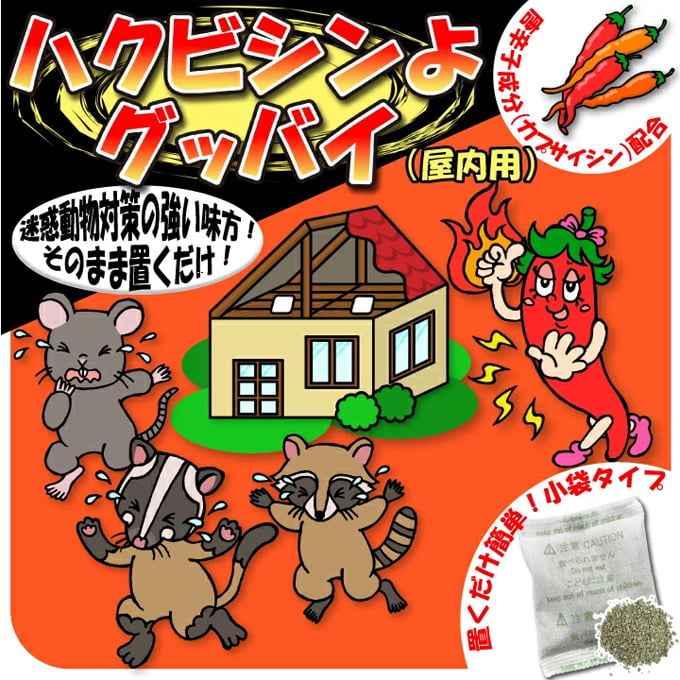 撤くだけで簡単な顆粒タイプ「屋外用」と、置くだけの小袋タイプ「屋内用」がございます。唐辛子成分(カプサイシン)配合で人と環境に優しい忌避剤です。
