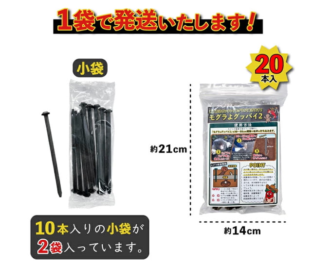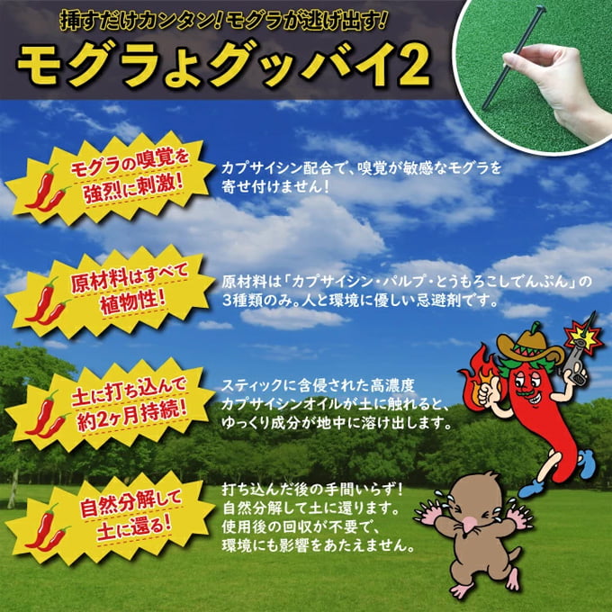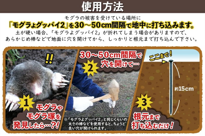 建材ナビ・スタッフからのコメント モグラよグッバイ2は、土に打ち込むだけで約2か月効果が持続、打ち込んだ後は自然分解して土に還るため回収などの手間も不要です。モグラ被害に、是非、お試しください!