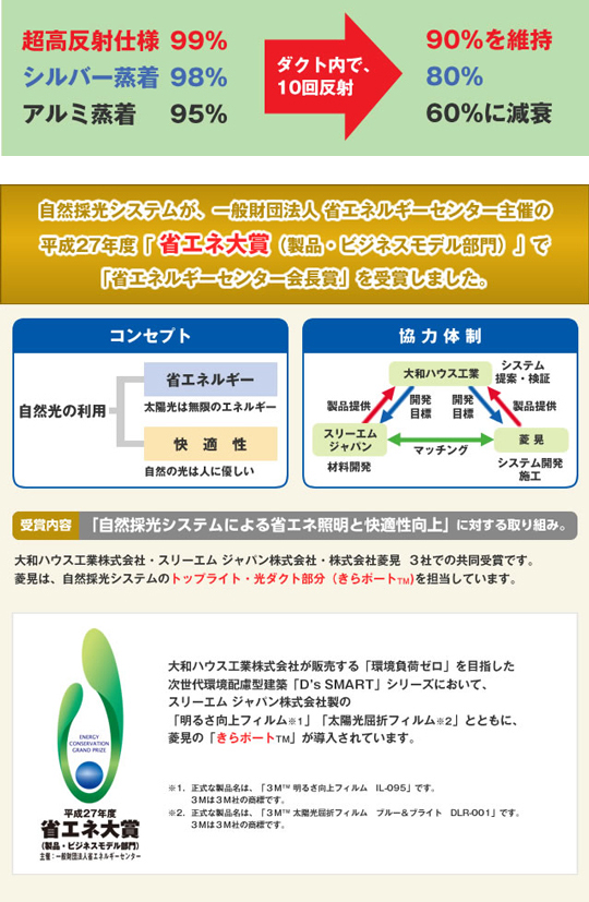 トップライトから採光した光を室内に導く内部ダクトは、99%以上の高い反射率※。