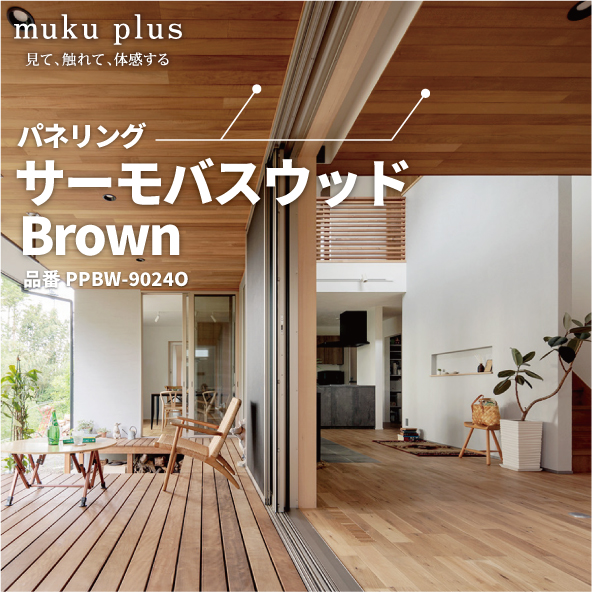 今回ご紹介する“サーモバスウッド”は、サーモ処理を施す事でブラウン系の色目をもつ無垢材パネリングです。