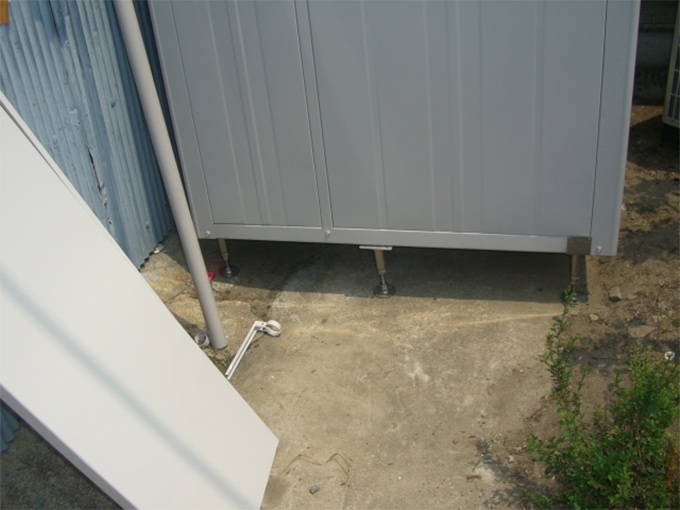 二つ目は傾斜地にも画期的な安定を保つ床束。凸凹で不安定な場所にも、水平にデッキや物置を設置できます。