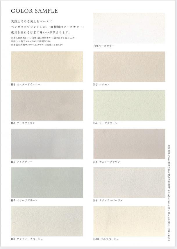 漆喰本来の純白をベースカラーとし、その他に10色の専用カラーを現場配合することで温かみのある色合いが生まれます。成分は天然土とベンガラ(酸化鉄)のみを配合しておりますので、安心してご使用いただけます。