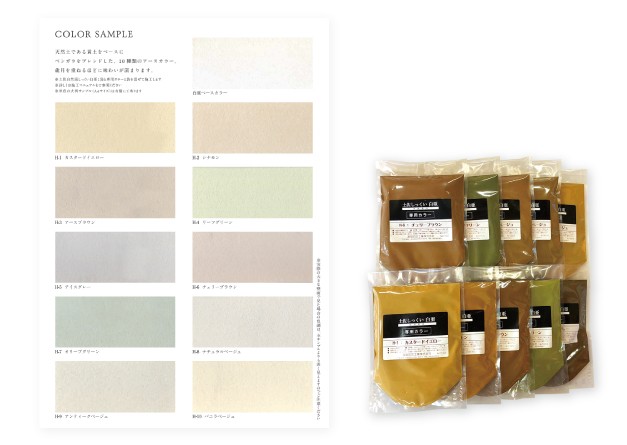 高温多湿な日本の気候風土に適した調湿性、防カビ性、抗菌性など多くの機能性を持ち、シックハウスや化学物質過敏症への対策としてもご使用頂いています。天然土が主原料のアースカラー10色もご用意しています。
