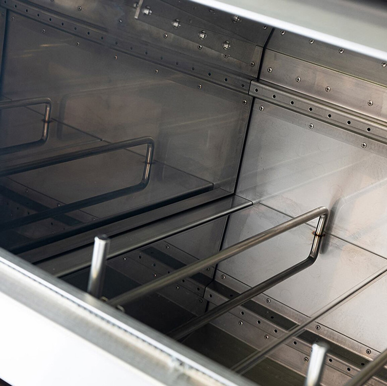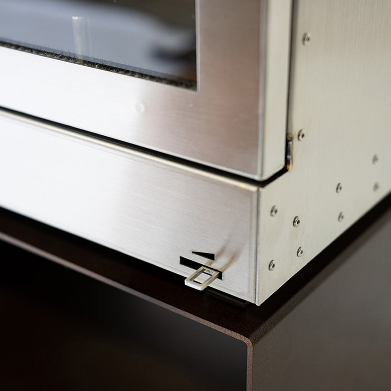 BLISS-HLは、BLISS-SPの持つ基本的なデザインを踏襲しつつも、フロントパネルはパンチングを廃止しフラットパネルに。余計な装飾をせず、ステンレス素材が持つ直線的なクールさを引き立てるよう心がけました。また、グリップはレザーカバーで握りやすくし、本体側面には持ち手を設置するなど、デザイン性だけでなく実用性にも優れています。