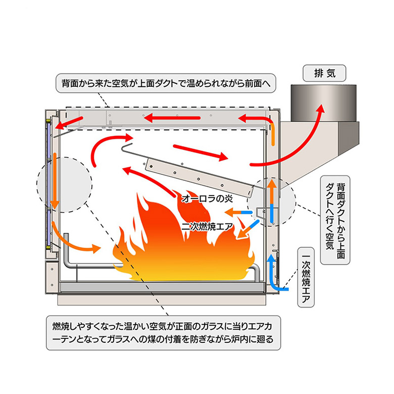 FIREGRAPHIXの薪ストーブの特徴は美しい炎をいつまでも見れること。BLISS-HLでもエアカーテンによるクリアな炎や、オーロラバーンをお楽しみいただけます。また、空気調整レバーにより、ゆっくり揺らめく炎から、激しく燃える神々しい炎までお好みで楽しめます。空間を暖めたいときはレバーを開けて高火力で燃やし、薪の消費を抑えたいときはレバーを絞って経済的にコントロールができます。