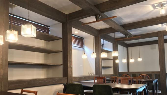 その点、工房志楽の化粧梁は、サイズ・形状が自由にオーダーできるので、デザインに合った物が選べます。 中身が空洞になっているので本物の古材より軽く、中に配線を通したりダウンライトを取り付けることも可能です。 サイズがオーダーできるので既存の梁を囲んで隠すといった使い方もできます。