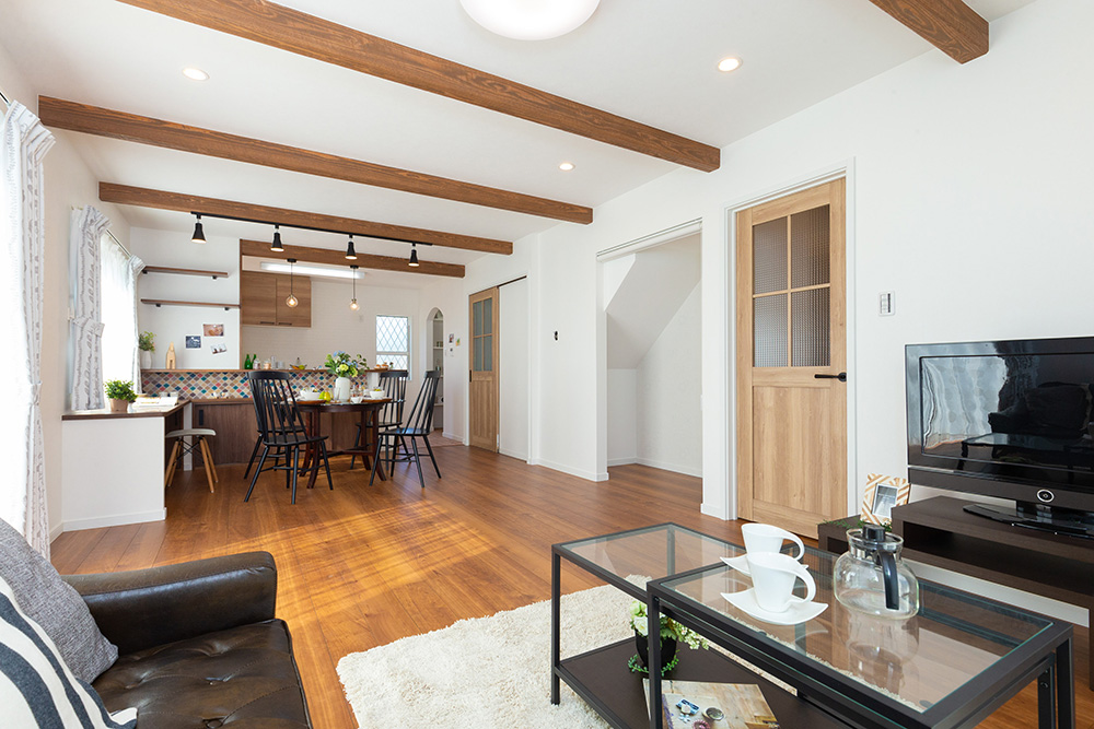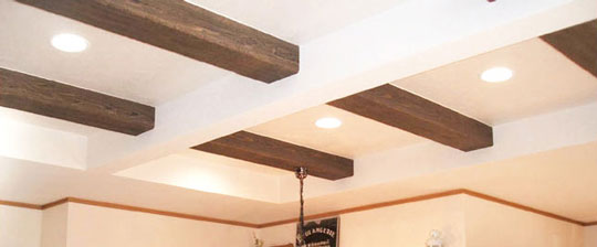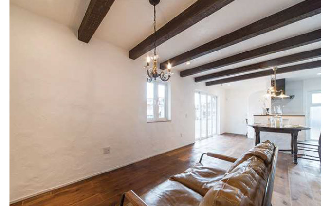 天然木の温もりと古材風の質感にこだわった化粧梁、オールドシダービームス