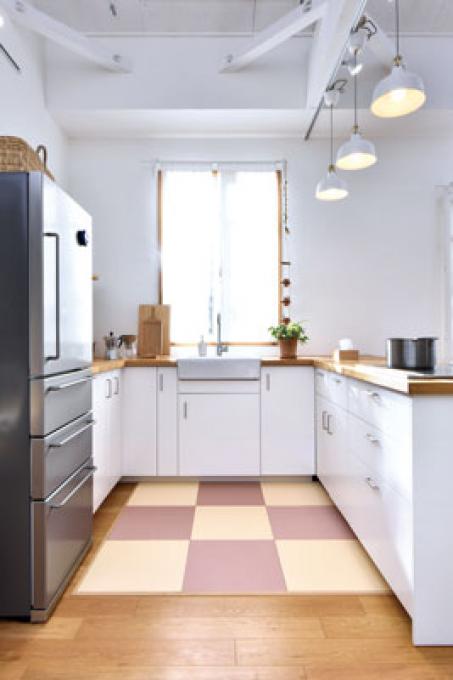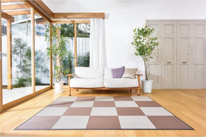 床面を傷つけず、張り替え自由。お手軽に和モダン空間が楽しめる琉球畳風、縁なし琉球畳風 「花たたみHAL」 と置くだけで手軽に和モダンのおもてなし空間を演出する、