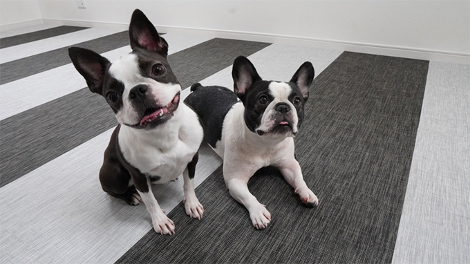 わんちゃんが滑りにくく、耐久性やクッション性、耐水性、防炎認定の安心安全な床材。
