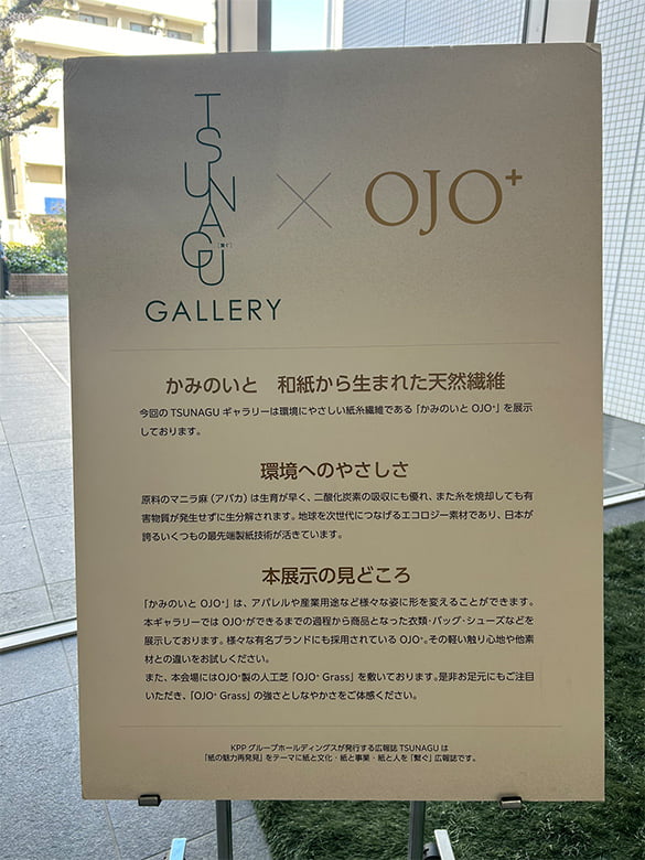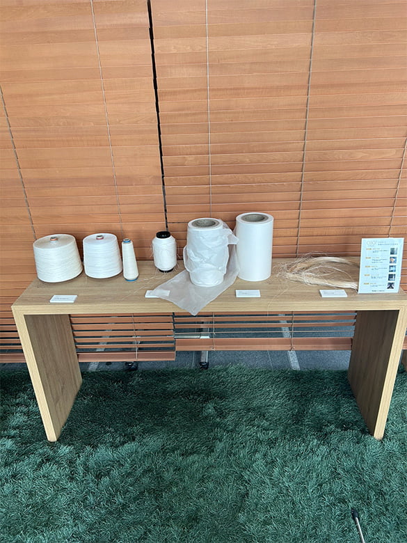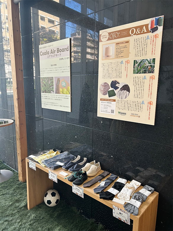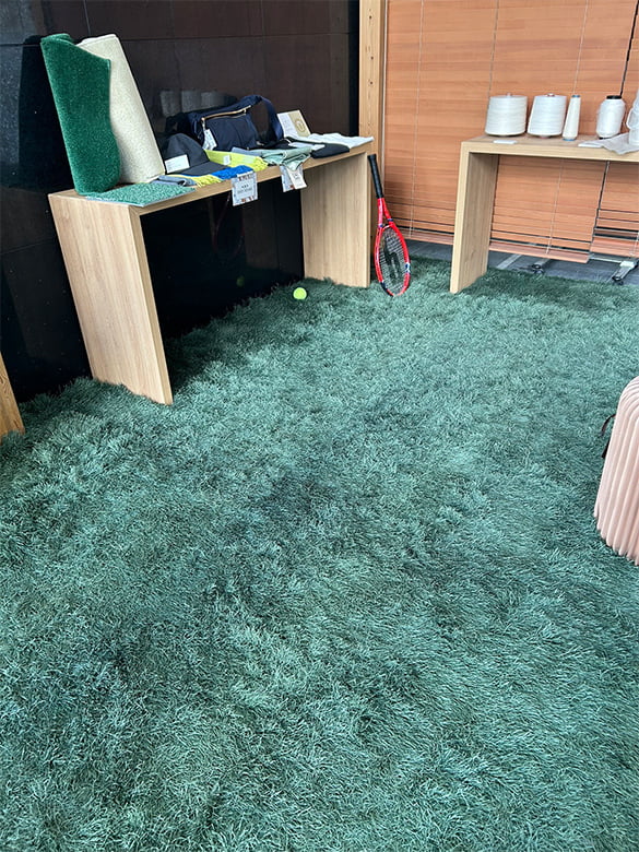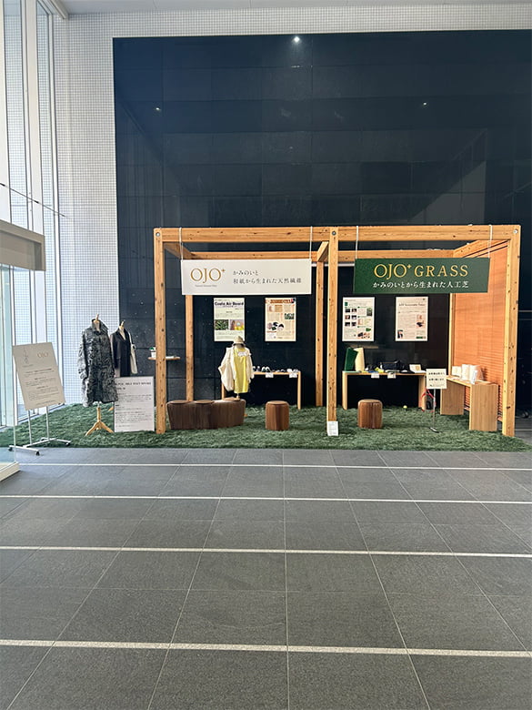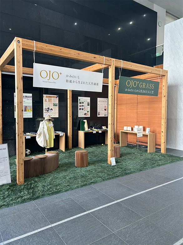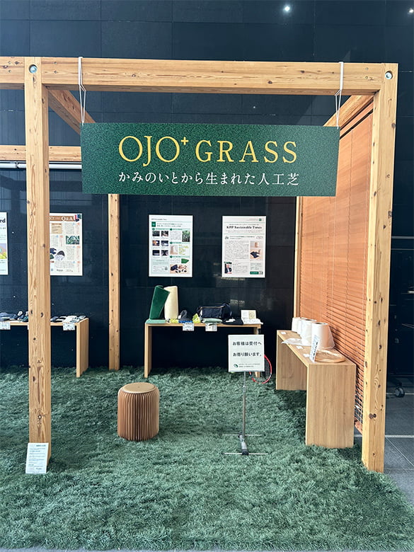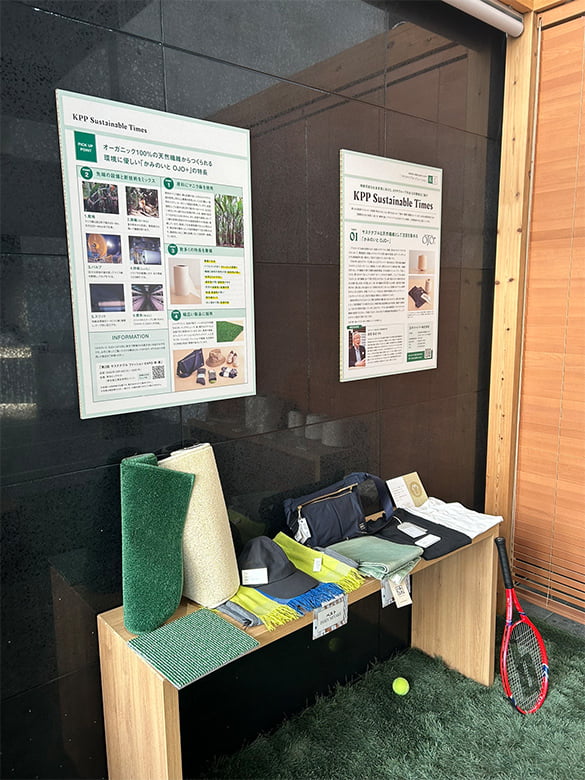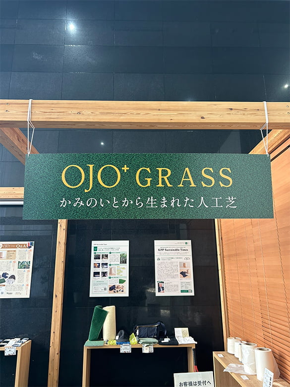 国際紙パルプ商事1FにてOJO人工芝とOJOいとなどで製造された製品をご覧いただけます。