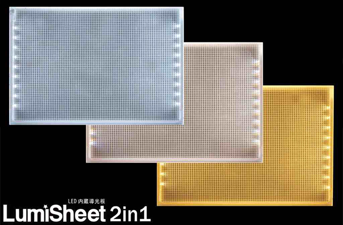 電球色と昼光色のLEDが1枚の導光板に内蔵されてた色温度可変型のLED内蔵導光板。