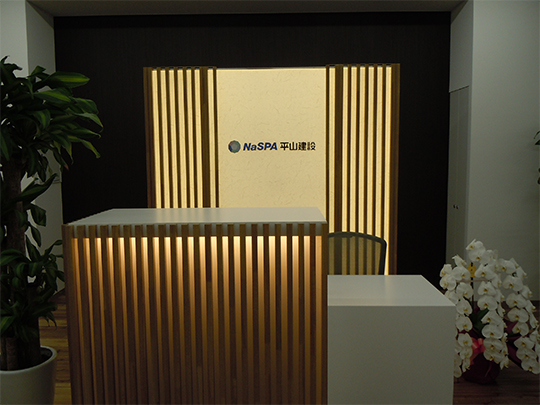 写真は受付カウンターのバックパネルの光源として使用した一例で、和紙調の表面材を用いて和テイストを表現しています。