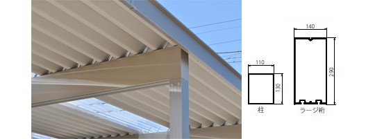 ラージ桁の開発によって最大間口9m×奥行き6mのワイドな空間を実現。広々としたスペースに4台まで駐車できます。また、従来のトラス桁にくらべて、外観がすっきりとしているのも大きな特長です。