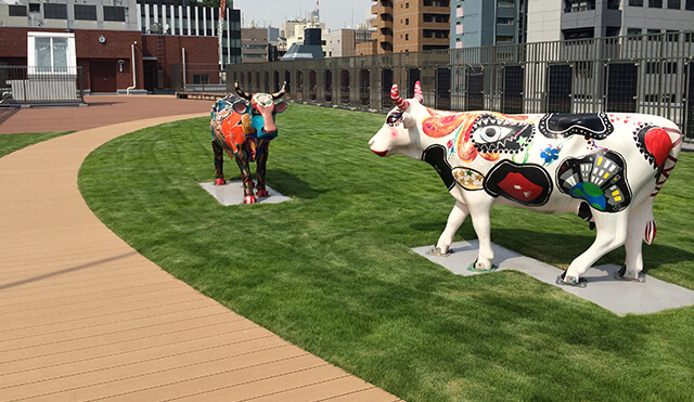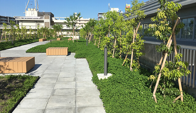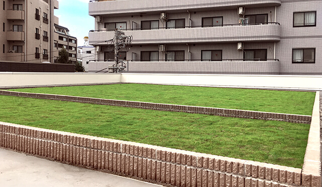 場所を問わず、人工地盤上にシステムを置いて、芝生や地被類、低・中木も植えることができますので、緑地面積の確保が容易です。