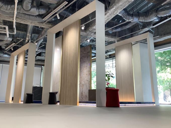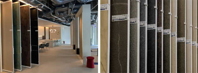 お客様の多様なデザインへの要求にお答えする140種以上のコレクションを常時展示しております。3メートルを超える大判タイルの圧倒的なスケール感、立体的で豊かな表情、天然原料と精細なグラフィックから生まれるリアルな質感と色味、奥行のある深み、触れた時の肌ざわりや直観的な印象、LAMINAMで創られた空間やインテリア纏う空気感。画像・映像・言葉では表現しきれない体感としてのLAMINAMの魅力を「見て・触れて」ご体験ください。館内各所に設置された調光システムにより照明環境による印象の変化もご確認頂けます。